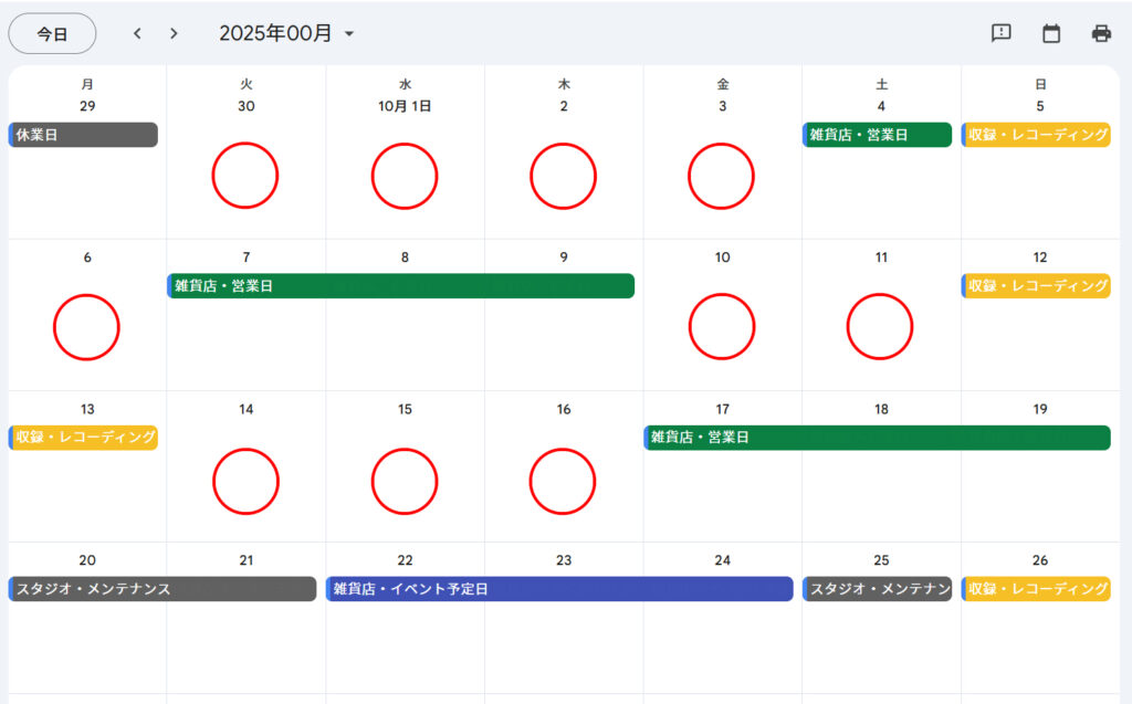 ※スタジオをご利用いただける日:例※ 〇(赤の〇)の日が、スタジオを利用可能日となります。